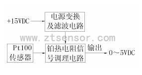 燃油溫度信號(hào)變送器的作用是將燃油溫度傳感器在-55℃~300℃范圍內(nèi)隨溫度變化的鉑熱電阻值變換為隨溫度變化的電壓信號(hào)并進(jìn)行放大與線性修正,轉(zhuǎn)換為0~5VDC電壓信號(hào)輸出。燃油溫度信號(hào)變送器采用專(zhuān)用鉑電阻信號(hào)調(diào)理集成電路并配以少量精密電子元器件,因此電路結(jié)構(gòu)簡(jiǎn)單,性能穩(wěn)定可靠。原理框圖如圖1所示。