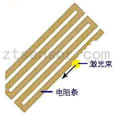 通過薄膜補(bǔ)償電阻網(wǎng)絡(luò)的組合,可以將傳感器的零點(diǎn)控制在±2000μV范圍內(nèi),但傳感器的零點(diǎn)輸出要求滿足±500μV要求。而且傳感器經(jīng)過高低溫、加載疲勞、長(zhǎng)期的零點(diǎn)時(shí)漂后,還要保證輸出在±500μV內(nèi),這需要在傳感器的裝配、調(diào)試過程中反復(fù)補(bǔ)償。僅通過電阻組合或外并電阻補(bǔ)償,工藝調(diào)試量大,也很難準(zhǔn)確到位。在本項(xiàng)目中,加入了先進(jìn)的激光調(diào)阻工藝,對(duì)電阻條的阻值進(jìn)行修正。激光調(diào)阻示意圖如圖2。